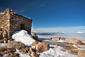 | Cooper Spur shelter, Helens, Rainier, Adams above the inversion |